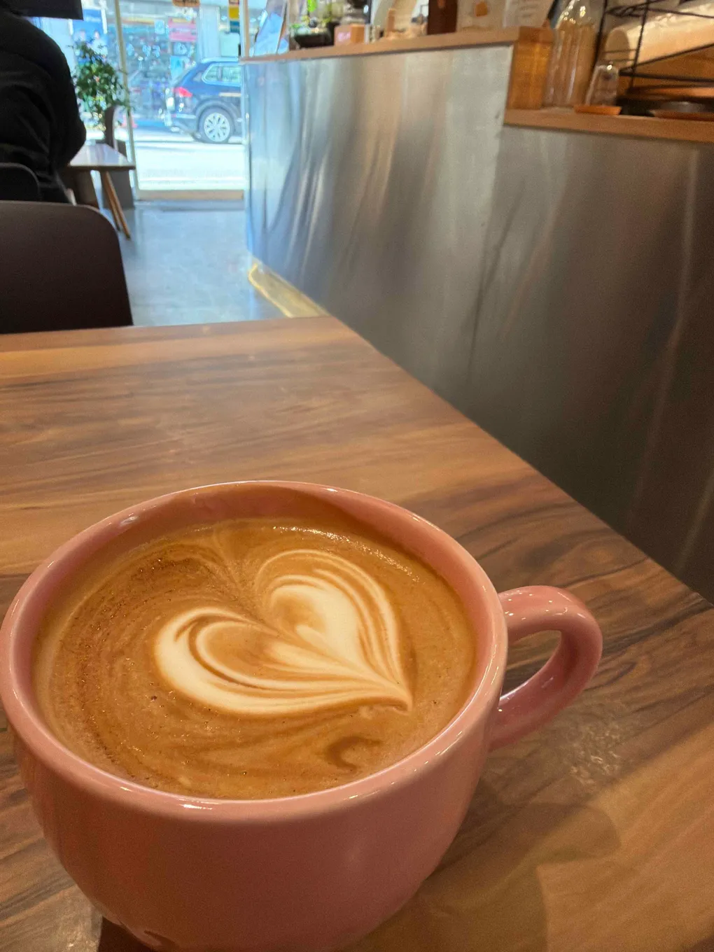핑크색 머그에 담겨 나온 카페라떼. 라떼 아트가 하트 모양으로 깔끔하게 그려져 있다. 예쁜 건 둘째치고, 한 모금 마셔보면 우유와 에스프레소의 비율이 잘 맞는다는 걸 느낀다. 쓰지도, 밍밍하지도 않은 딱 좋은 밸런스.